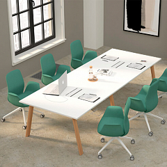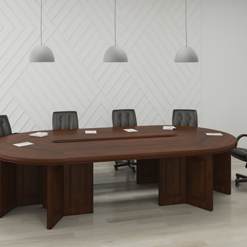 - форма: для вытянутого конференц-зала подойдет овальный или прямоугольный стол, для небольшого помещения – круглый или квадратный;